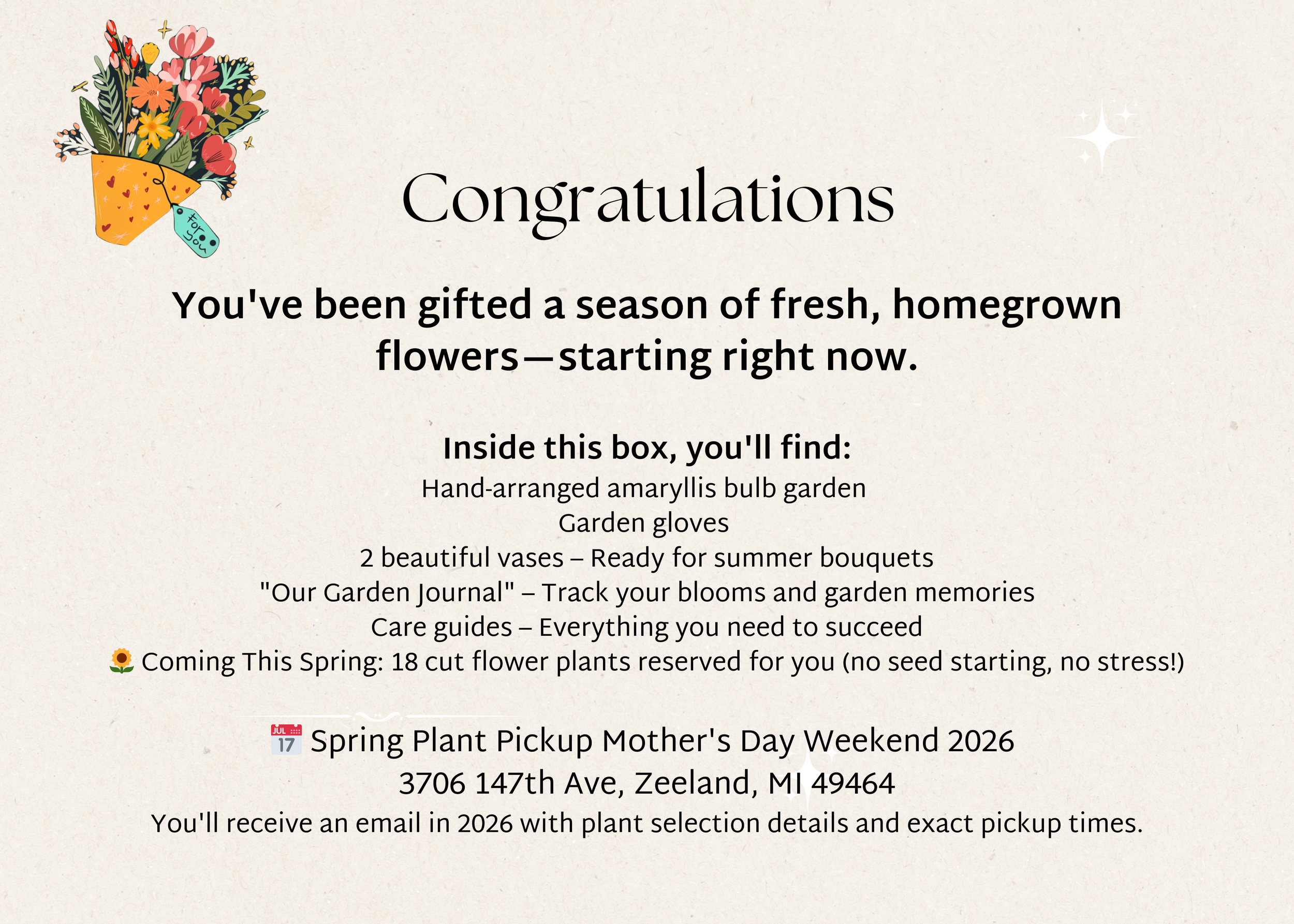 Beautiful gift card explaining spring plant pickup